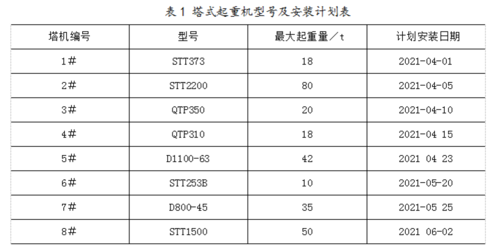 C 公司承建某会展中心建设工程,地下 3 层,地上 6 层,东西长 215m,南北长 280m,屋顶为钢结构屋面,最高点为 37.30m。该工程需安装多台塔式起重机进行钢结构吊装作业,塔式起重机型号及安装计划见表 1。