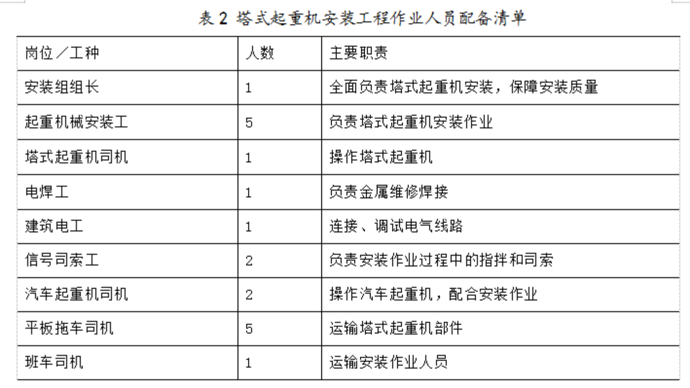 议,C 公司与具有起重设备安装工程专业承包一级资质的 E 公司签订了塔式起重机安装合同及安全管理协议。E 公司提供了作业人员配备清单,见表 2。