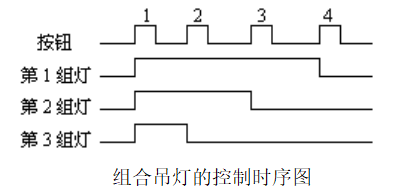 用一个按钮实现组合吊灯的3档(强、中、弱档)亮度控制,组合吊灯的控制时序如图所示。将按钮与PLC的输入端I0.0相连,组合吊灯的3组灯分别与PLC的输出端Q0.1~Q0.3相连。要求采用减计数器CTD记录按钮的按动次数,利用比较及置位/复位指令实现组合吊灯3组灯的点亮及熄灭控制,试设计梯形图程序。