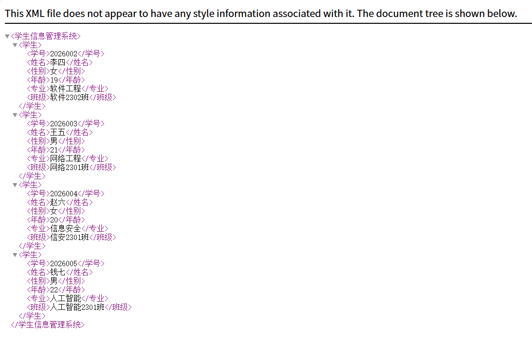 (3)在<学生信息管理系统>元素内添加学生信息,例如: